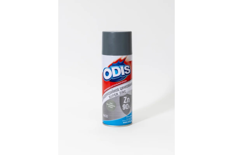 Краска-спрей супер цинк 90_ ODIS 030 (цинковое антикоррозионное покрытие Zn 90%) - предназначена для восстановления поврежденного покрытия из горячего цинкования, замены горячего цинкования, антикоррозионной и декоративной обработки, грунтования металлических поверхностей перед покраской.