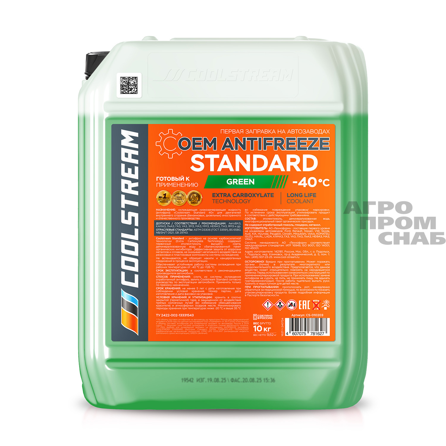 Coolstream Standard — 100% карбоксилатный антифриз (OAT), используемый для заправки в новые автомобили на заводах ГАЗ, КАМАЗ и др. Имеет официальный допуск АвтоВАЗ, прописан как рекомендованный антифриз в Руководстве по эксплуатации